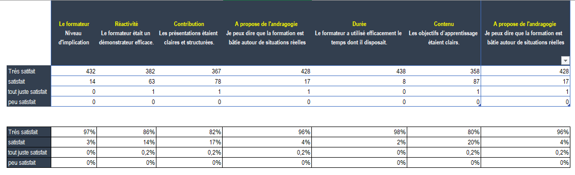 A chaque fin de formation nous évaluons la satisfaction et l’utilité perçue de la formation suivie. c’est une mesure indispensable pour que la formation a répondu aux attentes et aux besoins. La formalité globale utilisée pour mesurer l’efficacité des actions de formation est la suivante: